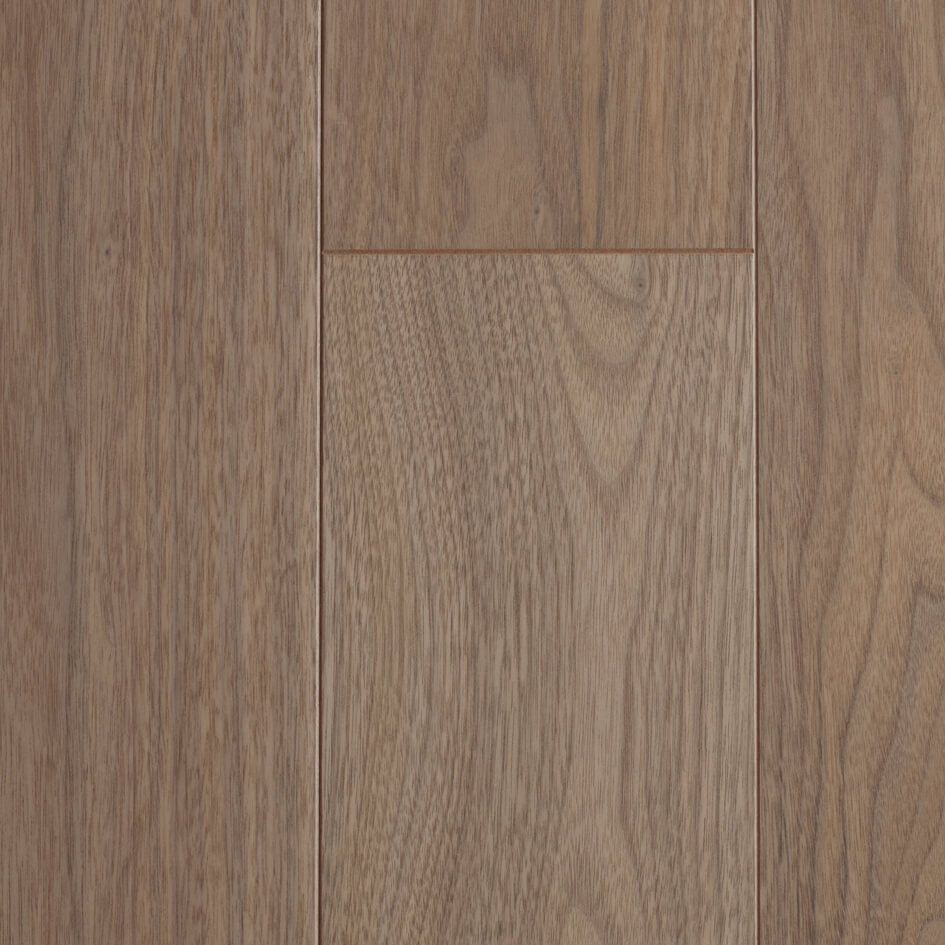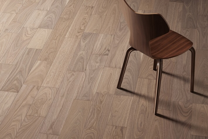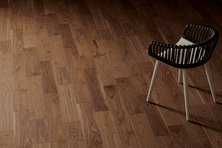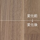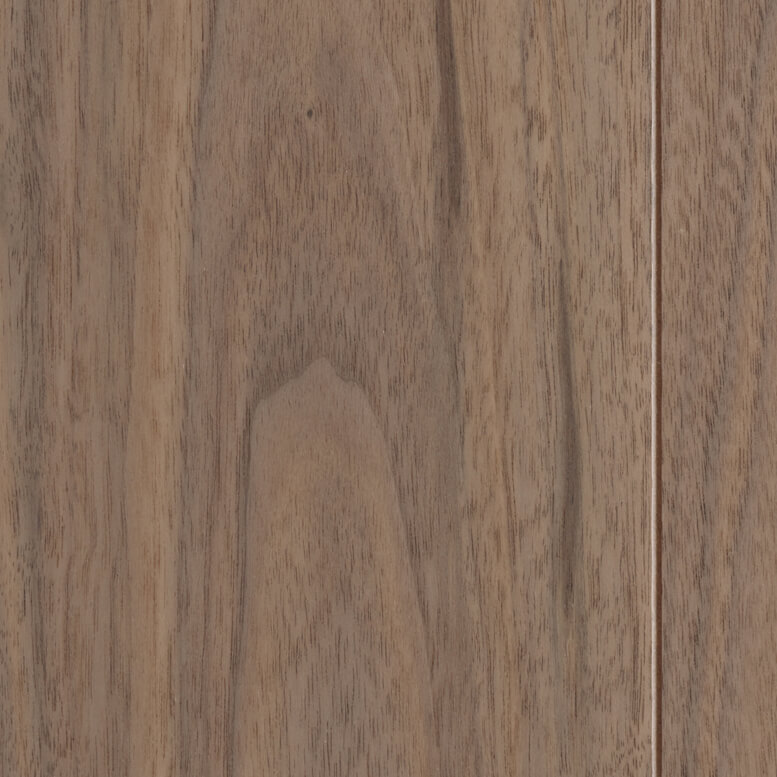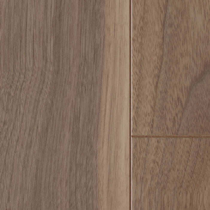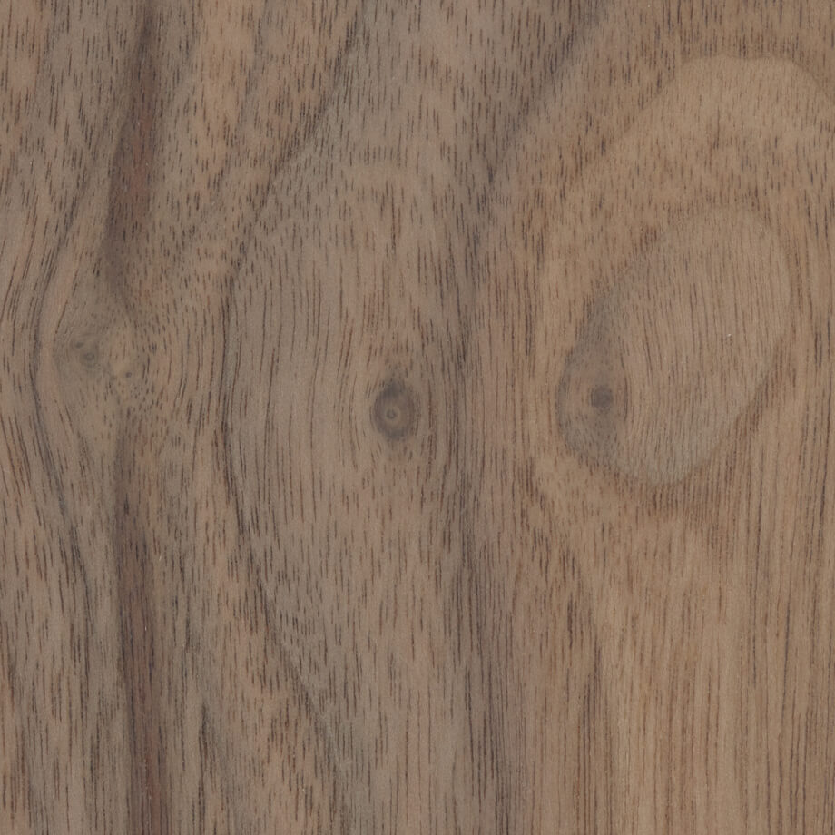 濃淡の縞模様を成す柾目、変化に富む紫褐色の板目を特徴とするブラックウォルナットの乾燥した無垢材が持つ柔らかな色合い・風合いを表現しました。