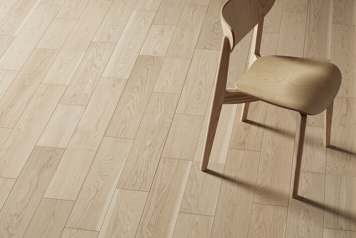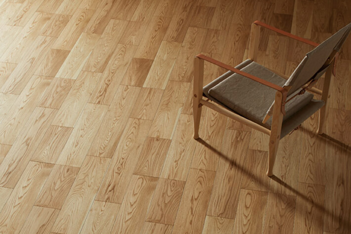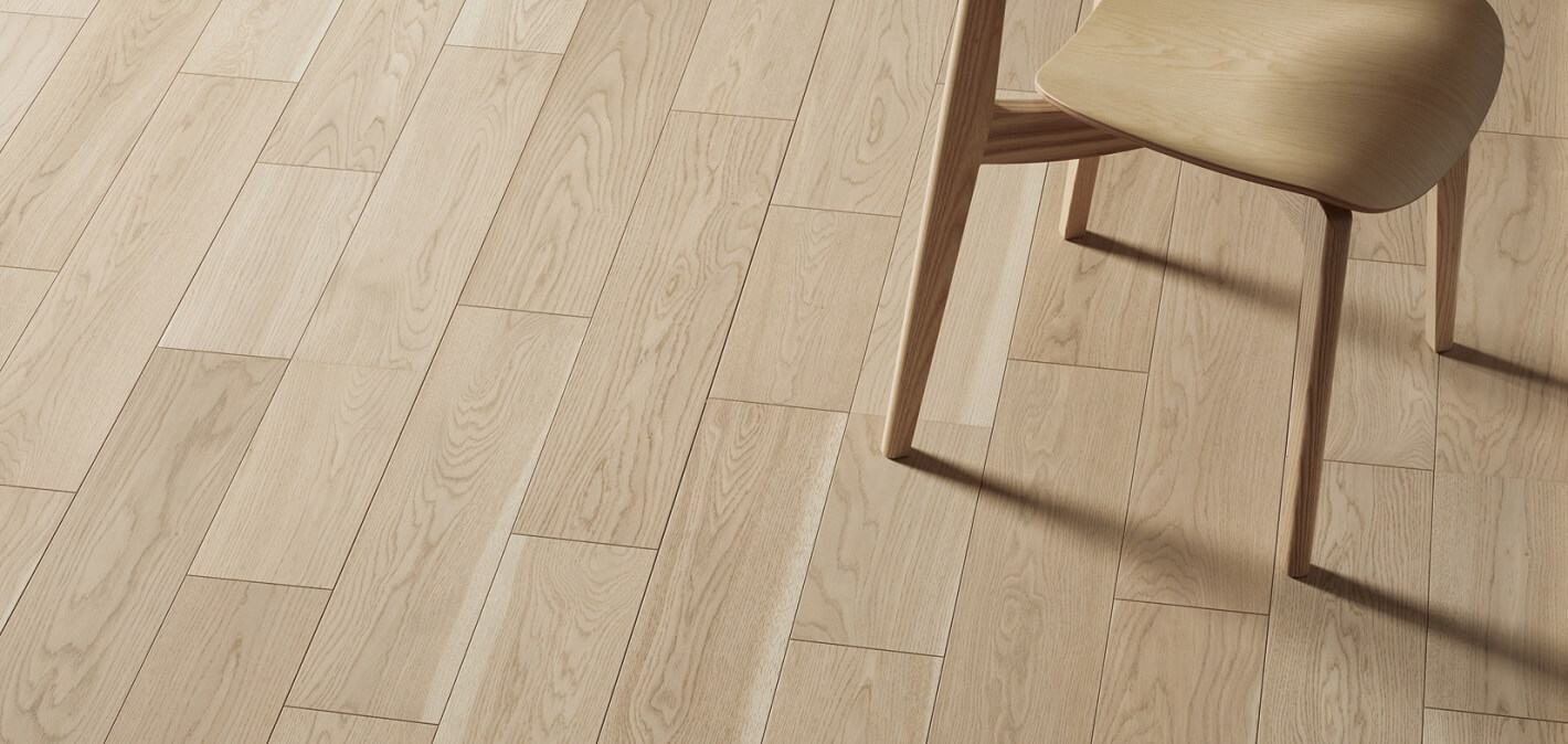 板目に強く現れる筍模様、柾目に現れる横縞状の斑(ふ)を特徴とするオークの乾燥した無垢材が持つ柔らかな色合い・風合いを表現しました。