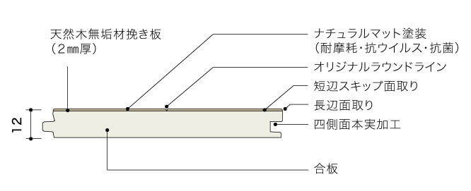 ※ヒノキは柔らかい樹種で、凹みが発生しやすいため、施工時の取り扱いには十分気をつけてください。また、キャスター付きの椅子・家具等の仕様は化粧材が材破する恐れがあるため避けてください。